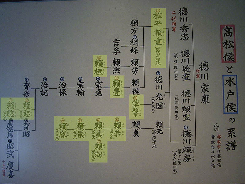 ![]() 2代藩主頼常は水戸光圀の実子であり、頼重の実子は水戸藩3代藩主となっている。兄である頼重を差 し置いて水戸藩主になったことを気にしたのであろう。水戸家の藩主は頼重の子孫と云うことになる。 |
