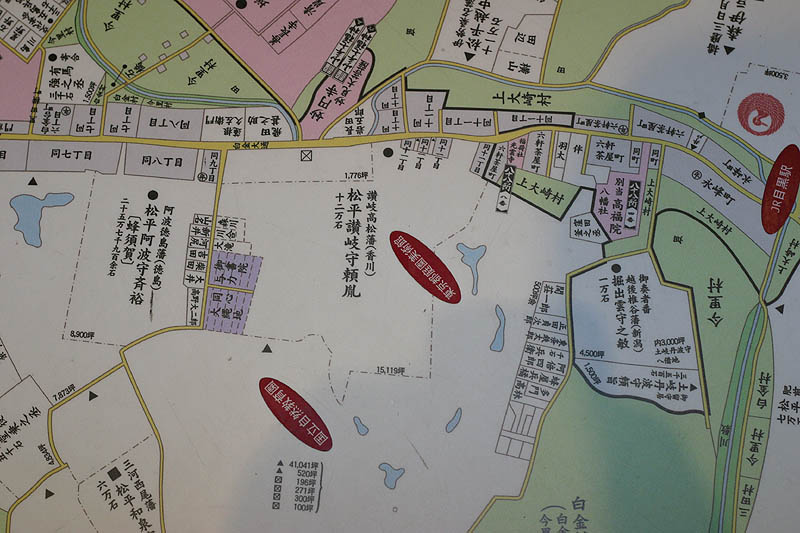 ![]() 10代藩主 頼胤公(幕末頃)の頃の江戸古地図を江戸東京博物館で撮影しました。 上屋敷は今のホテルエドモント付近にありました。水戸藩邸の向かいでした。 |